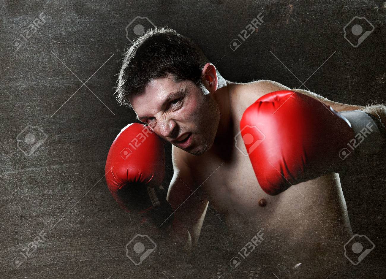 若い積極的な戦闘機人トレーニング シャドー ボクシング赤い戦闘手袋投げ悪質な左フック パンチ黒グランジ汚い背景に分離されて怒っている怒りの表情で の写真素材 画像素材 Image